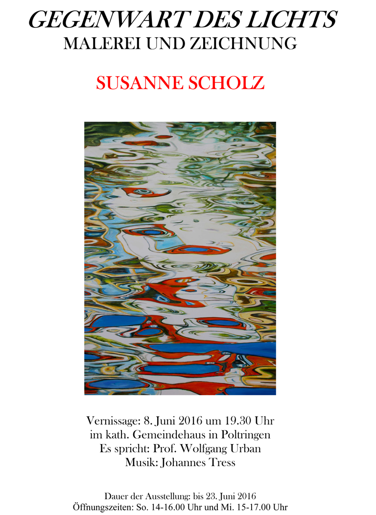 Die Ausstellung mit Malerei und Zeichnung von Susanne Scholz begreift das Wasser in seiner rätselhaftesten Form, nämlich der reflektierenden, verzerrenden und umformenden Oberfläche als künstlerische Herausforderung. So entstehen Bilder in ausdrucksstarker und farbintensiver Qualität. Spiegelungen in dieser Art malerisch umzusetzen, ist nach Dr. Gerhard Charles Rump, Berlin, eine der eigenständigsten Positionen in der aktuellen Kunstszene.
