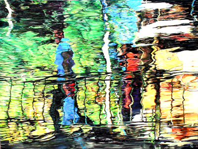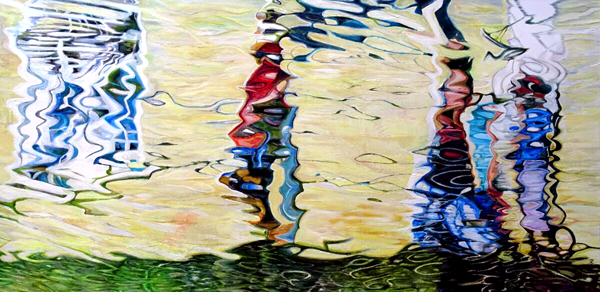 Seen und Teiche und Flüsse und Bäche sind integraler Bestandteil unserer Umgebung und starke Merkmale der Landschaft. Die Faszination, die das Wasser ausübt, hat in der Malerei ihre unverwechselbaren Spuren hinterlassen – in jüngster Zeit in den Wasserbildern der Künstlerin. In einigen dieser Wasserbilder treffen wir auf realistische Situationen, die den Dualismus existierender Gegenstände und ihre Reflexion(en) im Wasser beschreibend erklären. Sie sind in der Regel in den typischen Reflexionsmustern in bewegten Flüssigkeiten arrangiert. In manchen sehen wir den realen Gegenstand nur durch diese Reflexion, als solches kommt er im Bild nicht vor. Und in einigen sehen wir nur ein Farbenspiel, das so gut wie nichts darüber verrät, was reflektiert wird: Das Thema des Bildes ist die reine Reflexion an sich. Das hat natürlich mit Licht zu tun. Und dieses wiederum sieht so aus, als leuchte es aus sich heraus, was auf das Transzendentale verweist. Die Bilder der Wasser-Serie sind polyphon, sehr in der Art der polyphonen Musik. (G.C. Rump)